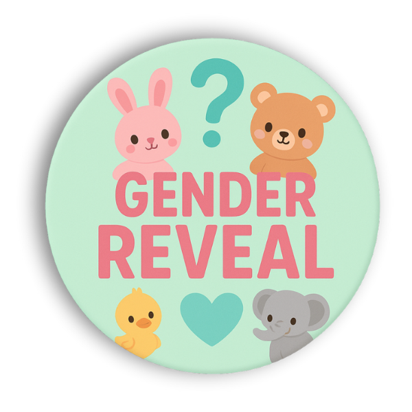 Make the big moment even more exciting with this charming gender reveal pin. The soft pastel design includes cute little baby animals like a bunny, bear, duckling, and elephant all gathered around a heart and question mark. It’s the perfect accessory to wear during a gender reveal party or baby celebration, adding a joyful and curious touch before the news is shared.